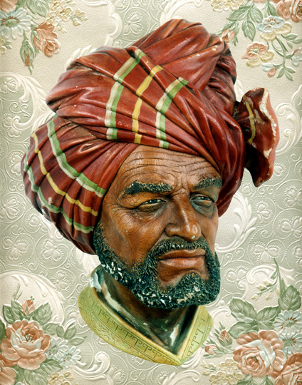 The heads in these images are wall plaque ornaments manufactured by Bossons Ltd. in the 1960s and 70s. Bossons produced an extensive range of ethnic and national types such as 'Kurd' and 'Syrian'. These were mass-produced chalkware but were finely detailed and remain popular as inexpensive collectables. The images in the series combine the heads with generic wallpaper patterns, invoking a sense of the domestic space where they would typically have been encountered. The appeal of the objects - which were probably inspired as much by cinematic narrative as imperialist fantasies of Otherness - derives perhaps from their evocation of freedom and adventure. In the Picturesque landscape the beauty of a wild and roughened nature was thought to be enhanced by the presence of certain rural figures. Shepherds, vagrants and gypsies were all admired for their life apart from domestication and urban systematization. For 18th century writers on the Picturesque, the fantasy of such oneness with nature was enjoyed through finding beauty in the rural poor - the simplicity of their homes and the rich textures of their worn and ragged appearance. The legacy of this aesthetic is with us still but is perhaps easier to locate in representations of people of the developing world rather than in expressions of a British rural poor, which is now far less locatable as a separate group. In the 1960s and 70s a fascination with peoples that were felt to exist outside the recognized order of urban home life appears to have surfaced as curious, superreal sculptures. One can think of these as trophy-like objects that make manifest international power relations in the closing days of Empire but such an attraction to exotic Otherness is also expressive of the containment and desire of those at home in the ''civilized' world. The Bossons range perhaps encapsulates the lack that is said to exist for subjects of the symbolic order, with vicariously lived adventure signifying an endless search for a return to wholeness and the corporeal.