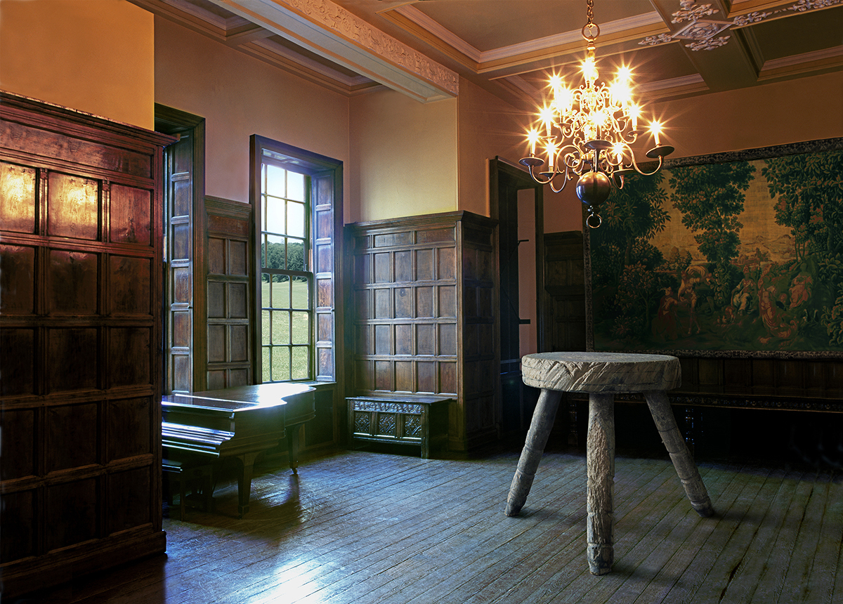 And Then There Were None forms part of an ongoing investigation of the picturesque.  In the series vantage point is explored as an integral element of the picturesque effect with the English country house being recognised as a defining space of social and physical elevation. Country houses of the late 18th and early 19th century were the crucible of the Picturesque movement where surrounding landscapes were 'naturalised' in order to evoke a more romantic, less industrialised, sense of the land. In the series, the country house is presented as the site of a 'whodunit' drama where the clues point towards misdemeanour and denial. Images such as Boudoir with Gun might make us think of abuses of power deriving from social and economic advantage but others - Study with Daffodils or Library with Knitting Needles, for instance, are less straightforward in their testimony. Both refer us to the land but in a way that runs contrary to the idea of land as commodity or expression of wealth. The daffodils perhaps allude more to romanticism than economic pragmatism, and the raw wool on the knitting needles is an ambiguous symbol of industry. Within this denial of land as land there emerges a sign of incompleteness - a psychical lack. The country house, it could be said, confers subjecthood on those who acknowledge its rich historical textures as their heritage. To do so, however, the viewer must negotiate a turbulence of myth and narrative. Subject status is gathered from the indicators of authoritative language, namely the treasured artefacts that speak of status and long-standing tradition. In the work this is contrasted with the external space, glimpsed through windows and referenced through decorative elements and invading light. Whilst the subject of ocular advantage in the house marks an entry into an abstract (paternal) symbolic order, the picturesque (imaginary) exterior is felt to be steadfast and maternal, and from a distance at least appears capable of returning a state of wholeness and stabilising identity.