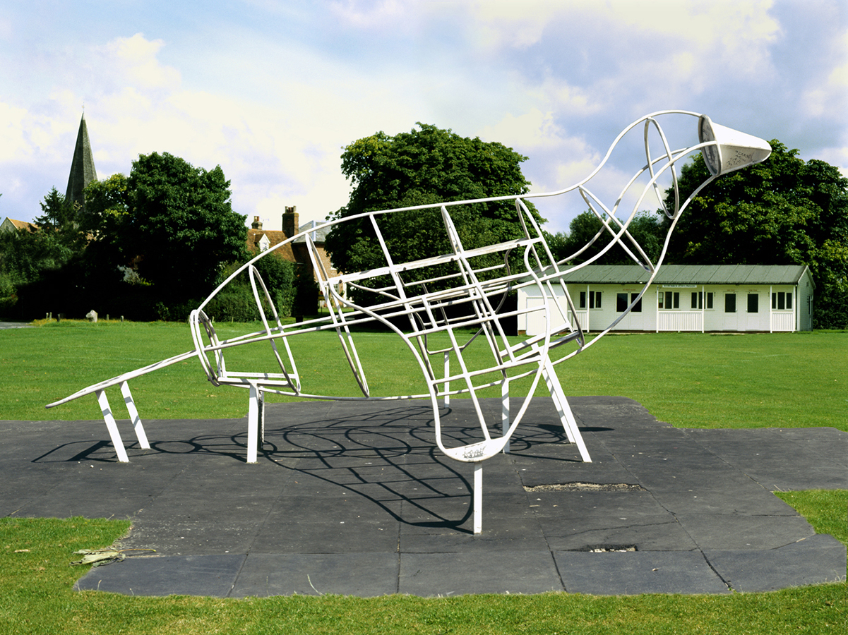 In the Climbing Frames series there is a suggestion of the rural environment being invaded by structures from the inner city. The climbing frames, each shaped as a form of transport, are rusting and antiquated and seem slightly at odds with their countryside setting. In actuality the frames were photographed in urban environments (mainly London) and digitally transferred to the fields and villages of Kent. Such forms of recreation are probably a familiar sight to anyone who grew up in the 1960s and 70s and spent their time in municipal play areas of the British townscape. Now eradicated from the more safety-conscious playgrounds of today, the tubular steel frames of the postwar years have been condemned to history, relics of the past that encapsulate an earlier, perhaps more innocent, perception of the world. In their day, the steel frame jet planes and rocket ships offered fantasies of escape and adventure. The ability of children to use the frames to play out narratives drawn from movies and television could be said to reveal the powers of youthful imagination, given that many of the inner city areas where the frames were located were far less expressive of escape and ‘open road’ opportunity. For many working class Londoners, the Kent countryside was an achievable place of escape but often only as a temporary one: for many, the yearly exodus to the hop farms of Kent served as an enjoyable working holiday. Paradoxically, British sci-fi movies of the postwar years have been linked to a fear of outside threats. Movies such as Children of the Damned (1964) and Quatermass and the Pit (1967) point to anxieties over changes taking place in the modern world: a fear that technology or immigration might bring about irrevocable change to life within the green and pleasant land.