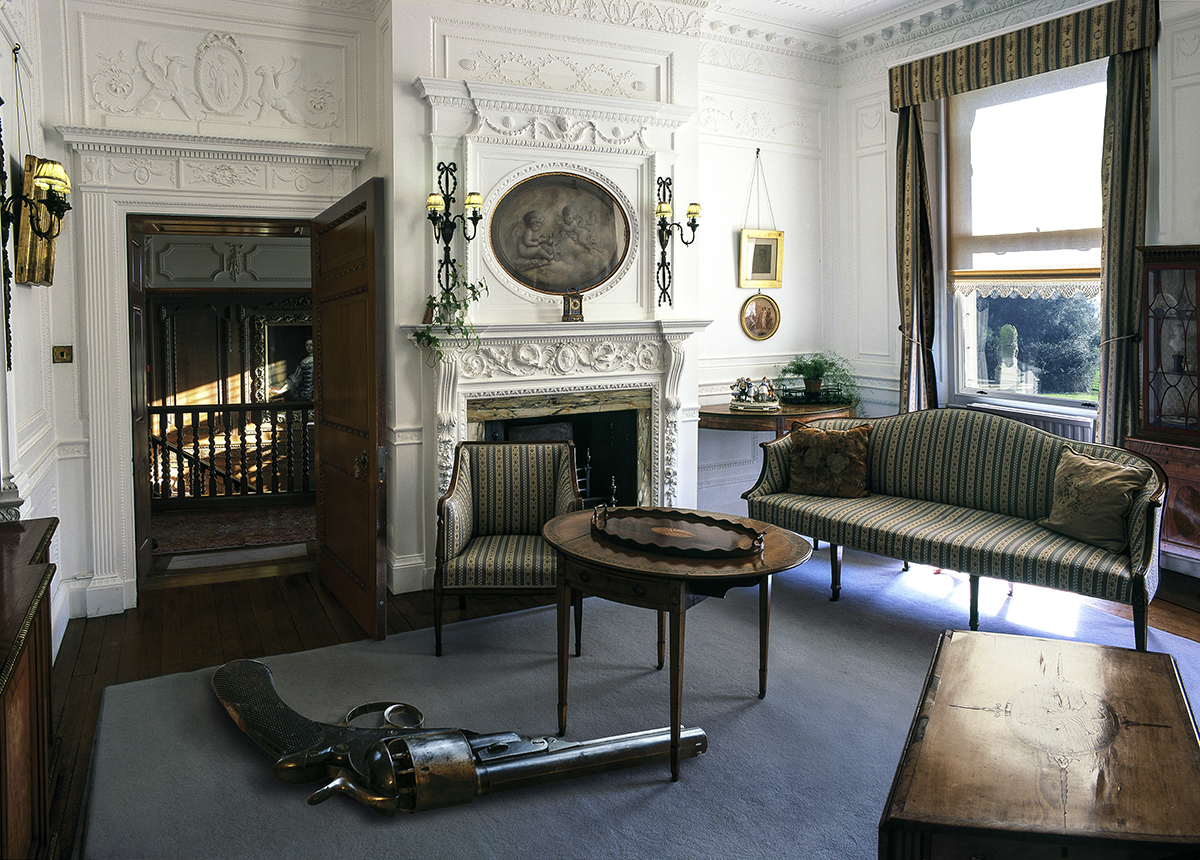 And Then There Were None forms part of an ongoing investigation of the picturesque.  In the series vantage point is explored as an integral element of the picturesque effect with the English country house being recognised as a defining space of social and physical elevation. Country houses of the late 18th and early 19th century were the crucible of the Picturesque movement where surrounding landscapes were 'naturalised' in order to evoke a more romantic, less industrialised, sense of the land. In the series, the country house is presented as the site of a 'whodunit' drama where the clues point towards misdemeanour and denial. Images such as Boudoir with Gun might make us think of abuses of power deriving from social and economic advantage but others - Study with Daffodils or Library with Knitting Needles, for instance, are less straightforward in their testimony. Both refer us to the land but in a way that runs contrary to the idea of land as commodity or expression of wealth. The daffodils perhaps allude more to romanticism than economic pragmatism, and the raw wool on the knitting needles is an ambiguous symbol of industry. Within this denial of land as land there emerges a sign of incompleteness - a psychical lack. The country house, it could be said, confers subjecthood on those who acknowledge its rich historical textures as their heritage. To do so, however, the viewer must negotiate a turbulence of myth and narrative. Subject status is gathered from the indicators of authoritative language, namely the treasured artefacts that speak of status and long-standing tradition. In the work this is contrasted with the external space, glimpsed through windows and referenced through decorative elements and invading light. Whilst the subject of ocular advantage in the house marks an entry into an abstract (paternal) symbolic order, the picturesque (imaginary) exterior is felt to be steadfast and maternal, and from a distance at least appears capable of returning a state of wholeness and stabilising identity.