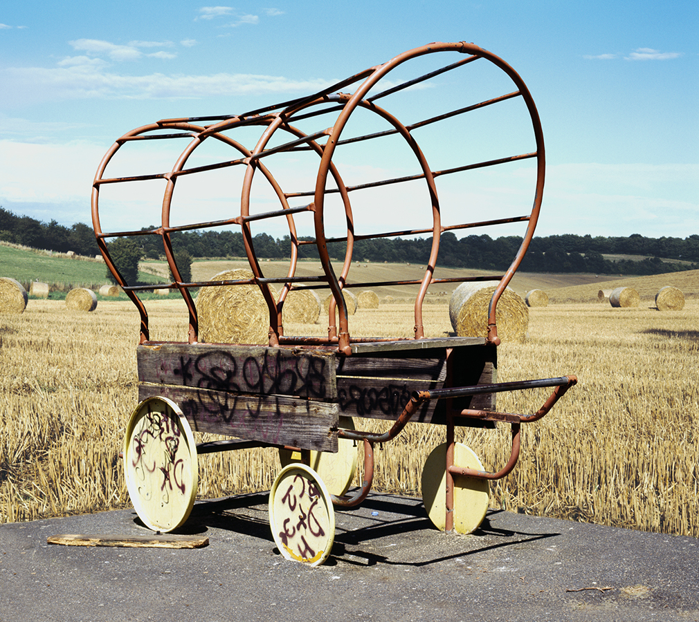 In the Climbing Frames series there is a suggestion of the rural environment being invaded by structures from the inner city. The climbing frames, each shaped as a form of transport, are rusting and antiquated and seem slightly at odds with their countryside setting. In actuality the frames were photographed in urban environments (mainly London) and digitally transferred to the fields and villages of Kent. Such forms of recreation are probably a familiar sight to anyone who grew up in the 1960s and 70s and spent their time in municipal play areas of the British townscape. Now eradicated from the more safety-conscious playgrounds of today, the tubular steel frames of the postwar years have been condemned to history, relics of the past that encapsulate an earlier, perhaps more innocent, perception of the world. In their day, the steel frame jet planes and rocket ships offered fantasies of escape and adventure. The ability of children to use the frames to play out narratives drawn from movies and television could be said to reveal the powers of youthful imagination, given that many of the inner city areas where the frames were located were far less expressive of escape and ‘open road’ opportunity. For many working class Londoners, the Kent countryside was an achievable place of escape but often only as a temporary one: for many, the yearly exodus to the hop farms of Kent served as an enjoyable working holiday. Paradoxically, British sci-fi movies of the postwar years have been linked to a fear of outside threats. Movies such as Children of the Damned (1964) and Quatermass and the Pit (1967) point to anxieties over changes taking place in the modern world: a fear that technology or immigration might bring about irrevocable change to life within the green and pleasant land.