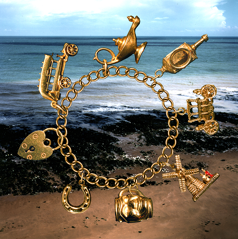 Roger Hopgood adds one realistic image to another to produce a visual puzzle. Whereas portraiture and news photographs are supposed to match expectations of ‘being there’, Hopgood’s pictures deny the normal ‘window’ function of the medium. Instead, small objects are made large and float in (or above) the landscape. These objects are either flat or occupy a very shallow space, whereas the landscapes are often deep, with horizons some way off. The eye is drawn to the landscape but the view is obstructed, often by brightly lit, kitsch or gimcrack objects. Why are they conjoined in this fashion? Are the two parts of the image just placed in some jocular or pointed opposition, such as a natural landscape with a cheap, transfer-printed plate of huntsmen and hounds? Clearly, the unsympathetic objects that hover in the foreground do indeed contrast with the views they obscure.