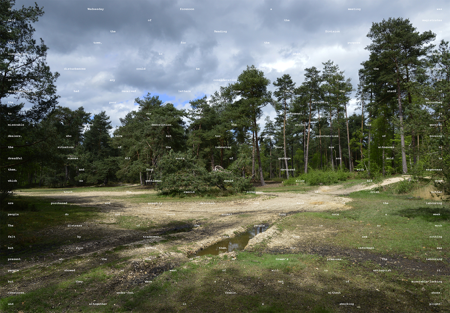 Even at the time of the Industrial Revolution there was a concern over the 'denaturing' of landscape, and it is felt by many that this triggered an embrace (by some at least) of the Romanticist aesthetic and mindset. In the early nineteenth century, the use of technology in rural areas could be equally controversial. During the ‘Swing Riots’ of 1830, rural labourers attacked the homes of farmers who had begun to use threshing machines; their fear for their livelihoods having already been brought on by Enclosure, which dispossessed them of common land and forced peasant farmers into labouring employment. In a series of shots of common land, I have overlaid text taken from articles in the Times newspaper (1830) describing riotous behaviour in nearby locations. These images are presented alongside a shot of a cell phone mast as way of introducing the notion of shared and enclosed space in the internet age.