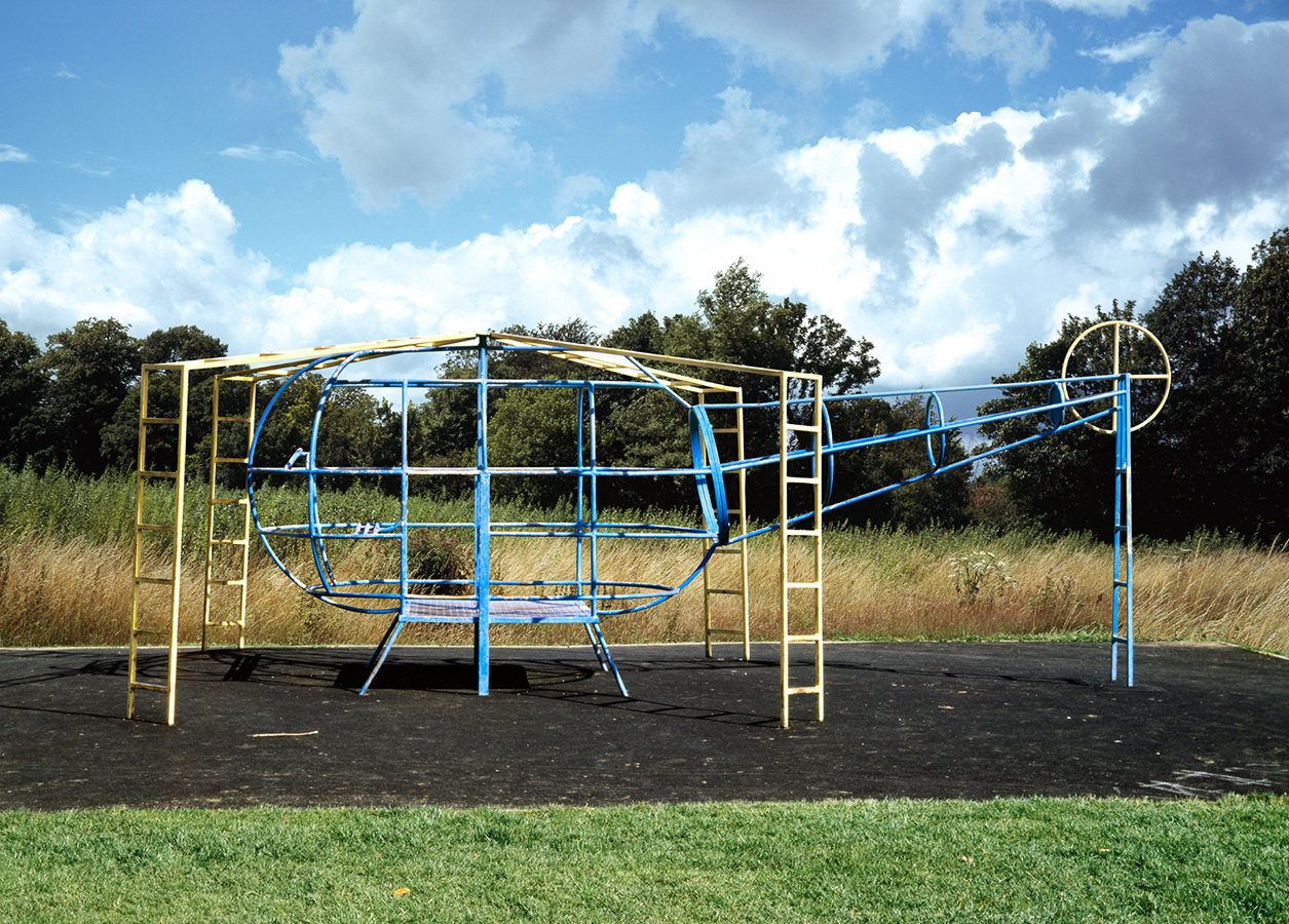 In the Climbing Frames series there is a suggestion of the rural environment being invaded by structures from the inner city. The climbing frames, each shaped as a form of transport, are rusting and antiquated and seem slightly at odds with their countryside setting. In actuality the frames were photographed in urban environments (mainly London) and digitally transferred to the fields and villages of Kent. Such forms of recreation are probably a familiar sight to anyone who grew up in the 1960s and 70s and spent their time in municipal play areas of the British townscape. Now eradicated from the more safety-conscious playgrounds of today, the tubular steel frames of the postwar years have been condemned to history, relics of the past that encapsulate an earlier, perhaps more innocent, perception of the world. In their day, the steel frame jet planes and rocket ships offered fantasies of escape and adventure. The ability of children to use the frames to play out narratives drawn from movies and television could be said to reveal the powers of youthful imagination, given that many of the inner city areas where the frames were located were far less expressive of escape and ‘open road’ opportunity. For many working class Londoners, the Kent countryside was an achievable place of escape but often only as a temporary one: for many, the yearly exodus to the hop farms of Kent served as an enjoyable working holiday. Paradoxically, British sci-fi movies of the postwar years have been linked to a fear of outside threats. Movies such as Children of the Damned (1964) and Quatermass and the Pit (1967) point to anxieties over changes taking place in the modern world: a fear that technology or immigration might bring about irrevocable change to life within the green and pleasant land.
