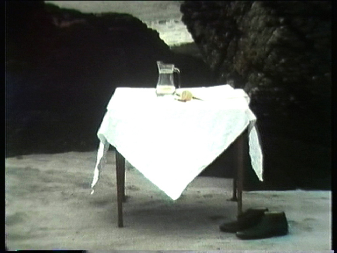 This 16mm film project draws inspiration from Daniel Dafoe’s Robinson Crusoe. Crusoe’s time on a desert island has prompted much reflection on the way in which the wilderness is tamed through the castaway’s ingenuity and his imposition of imported cultural practices. Unsurprisingly, Crusoe’s determination to make the wilderness more like home has been discussed extensively in relation to colonialism, with post-colonial readings unpicking the connections between Crusoe’s ideas of civilization and the justifications that were made in defence of colonial rule. Key to this discussion is Crusoe’s relationship with Friday, whom he teaches ‘civilizing’ ways and transforms into a dutiful slave. In the novel, the learning of language features as one aspect of Friday’s education but language can be viewed as the fundamental link with civilizing order if one perceived it as the antithesis of corporeality. In Home Comforts it is Crusoe who slowly absorbs the structure and lexicon of language. At the film’s beginning, Crusoe’s mind is ‘as clear as a freshly-wiped slate’, but as his memory returns it becomes the key to recognizing the extent of his predicament. Among his concerns is a sense of not being alone, of being in a territory where an Other is present - not so much as a threat of physical harm but as an ego ideal that begins to undermine his sense of his own achievements. The female voiceover, that against all odds asserts his ingenuity and prowess, raises the possibility that this virtual image of self is one that requires an external gaze to narrativize achievement and witness a mastery of space. Home Comforts was made in collaboration with performance artist Ian Sherman and was completed in 1993.
