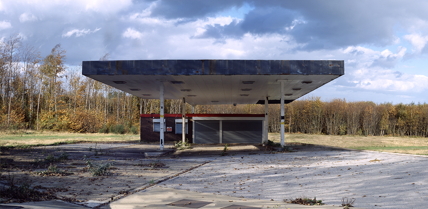 The ruin has long been associated with picturesque beauty. As far back as the 18th century is was found to be evocative of nature as a reclaiming force, with a pleasing melancholy being found in nature’s eventual annulment of all human endeavour. The gas station, by contrast, took on an entirely different meaning during its emergence as a cultural symbol. Long before anxiety over toxic byproducts and diminishing oil reserves, the gas station was a potent signifier of freedom. This use of the gas station is easily found in Hollywood cinema but a more unusual treatment of the filling station and the freedom it offered is found in Shell's television advertising campaign of the 1950s where the poet John Betjeman spoke of the pleasures of exploring the British countryside with the aid of Shell's network of filling stations. Shell also funded a series of tour guides, which a number of renowned artists and writers (including Betjemen) contributed to. In the current day, such an optimistic, view of motoring has passed. In addition to anxieties over costly, non-sustainable energy use, a streamlining of the industry has placed many filling stations beyond the point of economic viability and the gas station ruin is now a not uncommon sight. In the series, a digital transplanting of the ruins to a remoter landscape links their meaning to the original picturesque motif. Perhaps ultimately they signify that an era is reaching its end and the technology of oil powered transportation may soon be viewed with romantic affection.