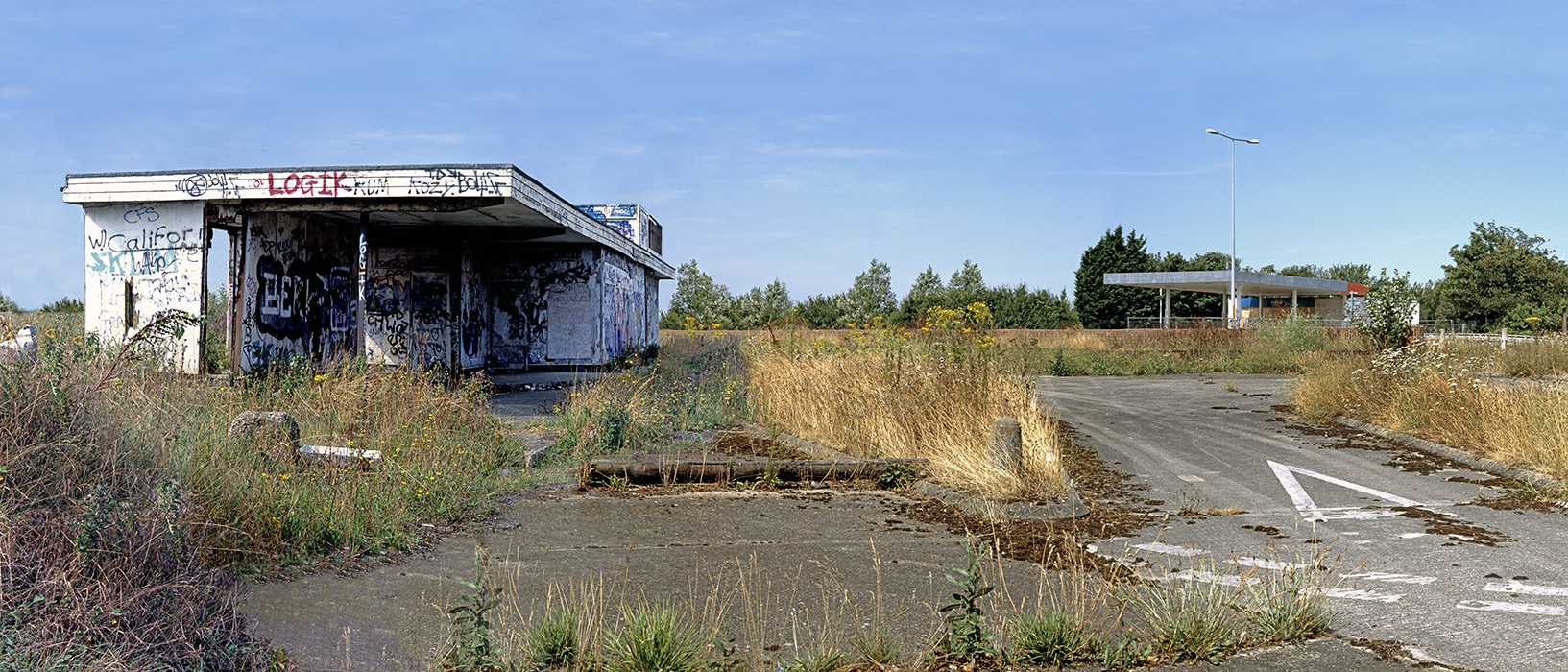 The ruin has long been associated with picturesque beauty. As far back as the 18th century is was found to be evocative of nature as a reclaiming force, with a pleasing melancholy being found in nature’s eventual annulment of all human endeavour. The gas station, by contrast, took on an entirely different meaning during its emergence as a cultural symbol. Long before anxiety over toxic byproducts and diminishing oil reserves, the gas station was a potent signifier of freedom. This use of the gas station is easily found in Hollywood cinema but a more unusual treatment of the filling station and the freedom it offered is found in Shell's television advertising campaign of the 1950s where the poet John Betjeman spoke of the pleasures of exploring the British countryside with the aid of Shell's network of filling stations. Shell also funded a series of tour guides, which a number of renowned artists and writers (including Betjemen) contributed to. In the current day, such an optimistic, view of motoring has passed. In addition to anxieties over costly, non-sustainable energy use, a streamlining of the industry has placed many filling stations beyond the point of economic viability and the gas station ruin is now a not uncommon sight. In the series, a digital transplanting of the ruins to a remoter landscape links their meaning to the original picturesque motif. Perhaps ultimately they signify that an era is reaching its end and the technology of oil powered transportation may soon be viewed with romantic affection.