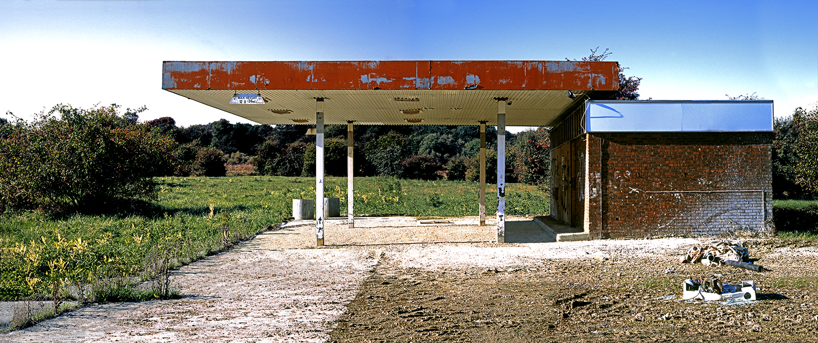The ruin has long been associated with picturesque beauty. As far back as the 18th century is was found to be evocative of nature as a reclaiming force, with a pleasing melancholy being found in nature’s eventual annulment of all human endeavour. The gas station, by contrast, took on an entirely different meaning during its emergence as a cultural symbol. Long before anxiety over toxic byproducts and diminishing oil reserves, the gas station was a potent signifier of freedom. This use of the gas station is easily found in Hollywood cinema but a more unusual treatment of the filling station and the freedom it offered is found in Shell's television advertising campaign of the 1950s where the poet John Betjeman spoke of the pleasures of exploring the British countryside with the aid of Shell's network of filling stations. Shell also funded a series of tour guides, which a number of renowned artists and writers (including Betjemen) contributed to. In the current day, such an optimistic, view of motoring has passed. In addition to anxieties over costly, non-sustainable energy use, a streamlining of the industry has placed many filling stations beyond the point of economic viability and the gas station ruin is now a not uncommon sight. In the series, a digital transplanting of the ruins to a remoter landscape links their meaning to the original picturesque motif. Perhaps ultimately they signify that an era is reaching its end and the technology of oil powered transportation may soon be viewed with romantic affection.