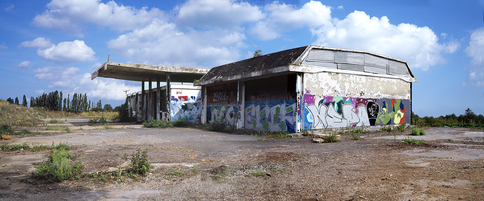 The ruin has long been associated with picturesque beauty. As far back as the 18th century is was found to be evocative of nature as a reclaiming force, with a pleasing melancholy being found in nature’s eventual annulment of all human endeavour. The gas station, by contrast, took on an entirely different meaning during its emergence as a cultural symbol. Long before anxiety over toxic byproducts and diminishing oil reserves, the gas station was a potent signifier of freedom. This use of the gas station is easily found in Hollywood cinema but a more unusual treatment of the filling station and the freedom it offered is found in Shell's television advertising campaign of the 1950s where the poet John Betjeman spoke of the pleasures of exploring the British countryside with the aid of Shell's network of filling stations. Shell also funded a series of tour guides, which a number of renowned artists and writers (including Betjemen) contributed to. In the current day, such an optimistic, view of motoring has passed. In addition to anxieties over costly, non-sustainable energy use, a streamlining of the industry has placed many filling stations beyond the point of economic viability and the gas station ruin is now a not uncommon sight. In the series, a digital transplanting of the ruins to a remoter landscape links their meaning to the original picturesque motif. Perhaps ultimately they signify that an era is reaching its end and the technology of oil powered transportation may soon be viewed with romantic affection.