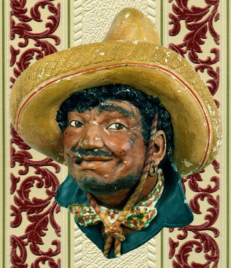 The heads in these images are wall plaque ornaments manufactured by Bossons Ltd. in the 1960s and 70s. Bossons produced an extensive range of ethnic and national types such as 'Kurd' and 'Syrian'. These were mass-produced chalkware but were finely detailed and remain popular as inexpensive collectables. The images in the series combine the heads with generic wallpaper patterns, invoking a sense of the domestic space where they would typically have been encountered. The appeal of the objects - which were probably inspired as much by cinematic narrative as imperialist fantasies of Otherness - derives perhaps from their evocation of freedom and adventure. In the Picturesque landscape the beauty of a wild and roughened nature was thought to be enhanced by the presence of certain rural figures. Shepherds, vagrants and gypsies were all admired for their life apart from domestication and urban systematization. For 18th century writers on the Picturesque, the fantasy of such oneness with nature was enjoyed through finding beauty in the rural poor - the simplicity of their homes and the rich textures of their worn and ragged appearance. The legacy of this aesthetic is with us still but is perhaps easier to locate in representations of people of the developing world rather than in expressions of a British rural poor, which is now far less locatable as a separate group. In the 1960s and 70s a fascination with peoples that were felt to exist outside the recognized order of urban home life appears to have surfaced as curious, superreal sculptures. One can think of these as trophy-like objects that make manifest international power relations in the closing days of Empire but such an attraction to exotic Otherness is also expressive of the containment and desire of those at home in the ''civilized' world. The Bossons range perhaps encapsulates the lack that is said to exist for subjects of the symbolic order, with vicariously lived adventure signifying an endless search for a return to wholeness and the corporeal.