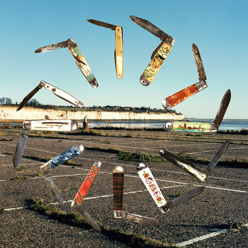 Roger Hopgood adds one realistic image to another to produce a visual puzzle. Whereas portraiture and news photographs are supposed to match expectations of ‘being there’, Hopgood’s pictures deny the normal ‘window’ function of the medium. Instead, small objects are made large and float in (or above) the landscape. These objects are either flat or occupy a very shallow space, whereas the landscapes are often deep, with horizons some way off. The eye is drawn to the landscape but the view is obstructed, often by brightly lit, kitsch or gimcrack objects. Why are they conjoined in this fashion? Are the two parts of the image just placed in some jocular or pointed opposition, such as a natural landscape with a cheap, transfer-printed plate of huntsmen and hounds? Clearly, the unsympathetic objects that hover in the foreground do indeed contrast with the views they obscure.