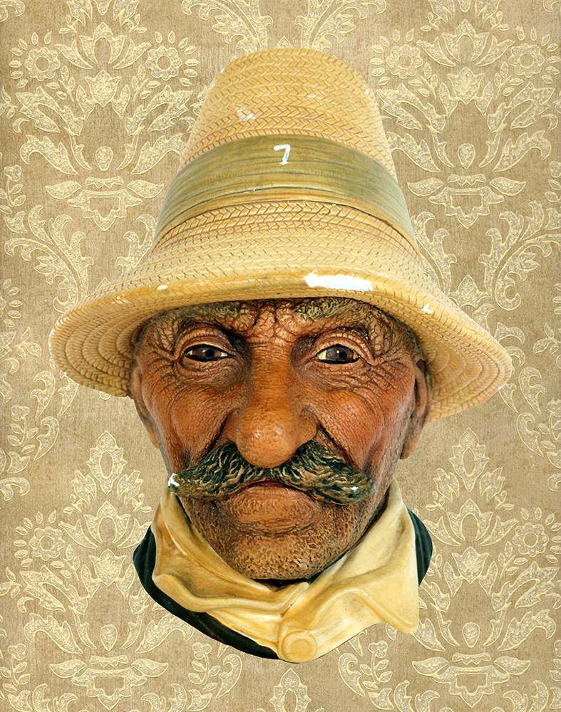 The heads in these images are wall plaque ornaments manufactured by Bossons Ltd. in the 1960s and 70s. Bossons produced an extensive range of ethnic and national types such as 'Kurd' and 'Syrian'. These were mass-produced chalkware but were finely detailed and remain popular as inexpensive collectables. The images in the series combine the heads with generic wallpaper patterns, invoking a sense of the domestic space where they would typically have been encountered. The appeal of the objects - which were probably inspired as much by cinematic narrative as imperialist fantasies of Otherness - derives perhaps from their evocation of freedom and adventure. In the Picturesque landscape the beauty of a wild and roughened nature was thought to be enhanced by the presence of certain rural figures. Shepherds, vagrants and gypsies were all admired for their life apart from domestication and urban systematization. For 18th century writers on the Picturesque, the fantasy of such oneness with nature was enjoyed through finding beauty in the rural poor - the simplicity of their homes and the rich textures of their worn and ragged appearance. The legacy of this aesthetic is with us still but is perhaps easier to locate in representations of people of the developing world rather than in expressions of a British rural poor, which is now far less locatable as a separate group. In the 1960s and 70s a fascination with peoples that were felt to exist outside the recognized order of urban home life appears to have surfaced as curious, superreal sculptures. One can think of these as trophy-like objects that make manifest international power relations in the closing days of Empire but such an attraction to exotic Otherness is also expressive of the containment and desire of those at home in the ''civilized' world. The Bossons range perhaps encapsulates the lack that is said to exist for subjects of the symbolic order, with vicariously lived adventure signifying an endless search for a return to wholeness and the corporeal.