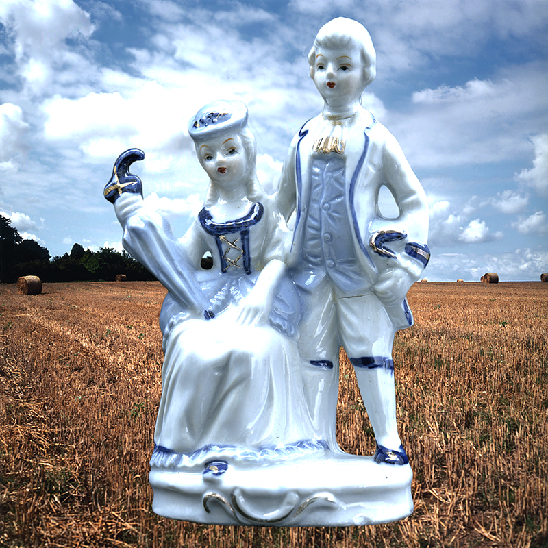 Roger Hopgood adds one realistic image to another to produce a visual puzzle. Whereas portraiture and news photographs are supposed to match expectations of ‘being there’, Hopgood’s pictures deny the normal ‘window’ function of the medium. Instead, small objects are made large and float in (or above) the landscape. These objects are either flat or occupy a very shallow space, whereas the landscapes are often deep, with horizons some way off. The eye is drawn to the landscape but the view is obstructed, often by brightly lit, kitsch or gimcrack objects. Why are they conjoined in this fashion? Are the two parts of the image just placed in some jocular or pointed opposition, such as a natural landscape with a cheap, transfer-printed plate of huntsmen and hounds? Clearly, the unsympathetic objects that hover in the foreground do indeed contrast with the views they obscure.